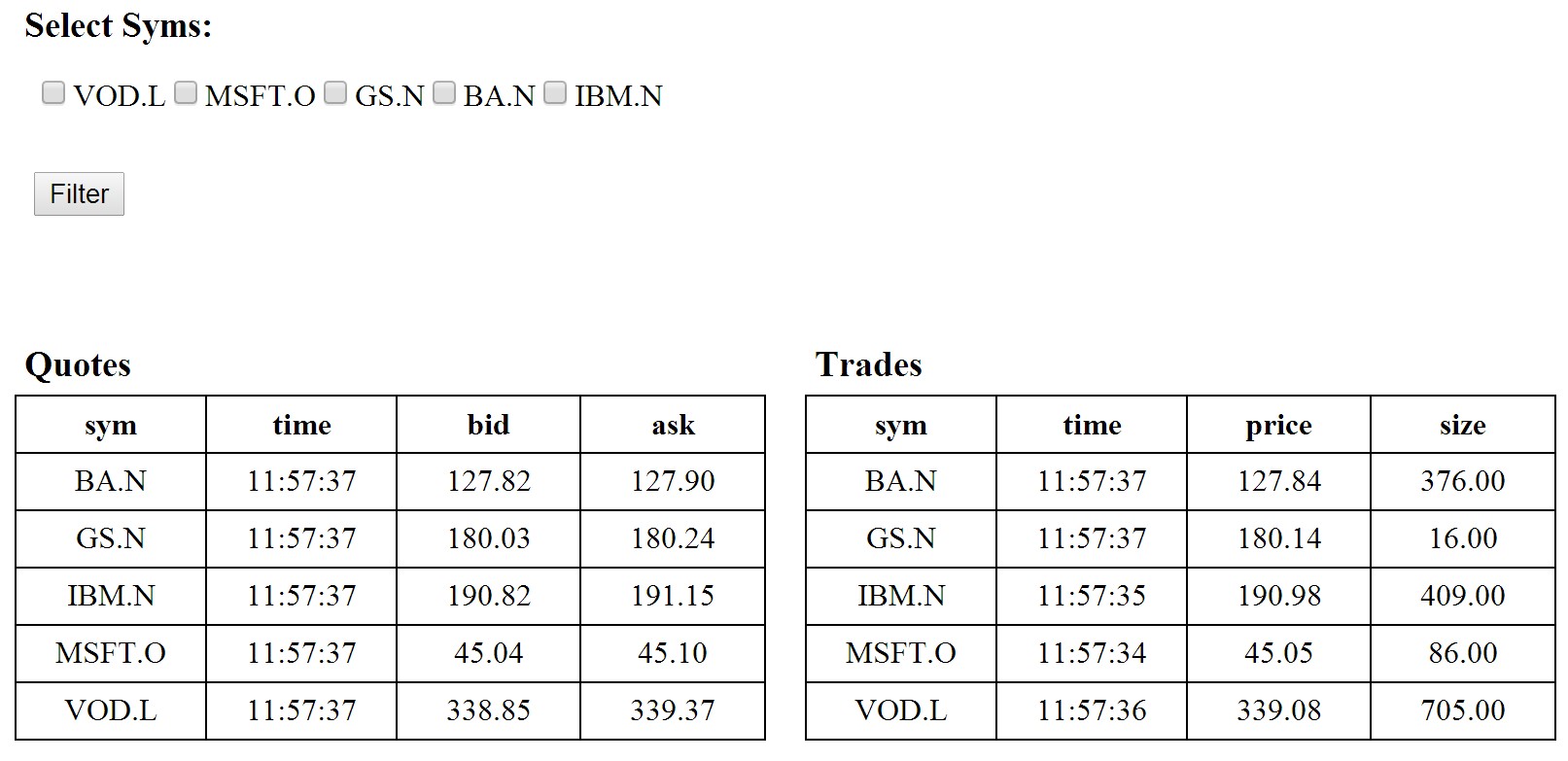 websockets.htmlin your browser. This will connect to kdb+ and display trade data in real-time, which can be filtered.