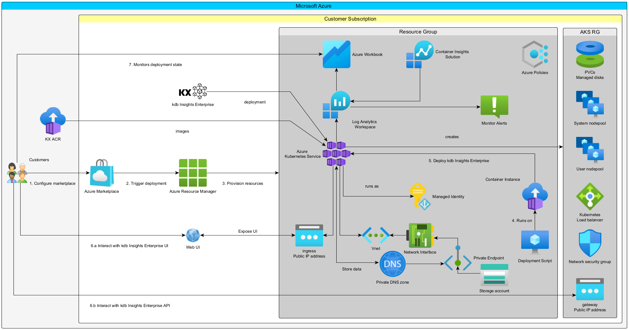 The Managed kdb Insights Enterprise Deployment offer on the Azure Marketplace spins up the resources and infrastructure as well as deploying the application. This offer leverages the Azure Managed Application mechanism. KX will have access to the relevant resource groups and will be able to manage the application on your behalf.