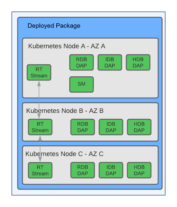 The exception is the database writer (Storage Manager), which is a single replica within each database. However, since the writer is not visible to queries, a failure or rescheduling of the writer does not impact ingestion and query workloads. This is because Kubernetes and the kdb Insights Operator bring the writer back online on a working node. During this time, additional data is held in memory in the real-time (RDB) data tier. When the writer comes back online, it continues to write data from the point where it left off.