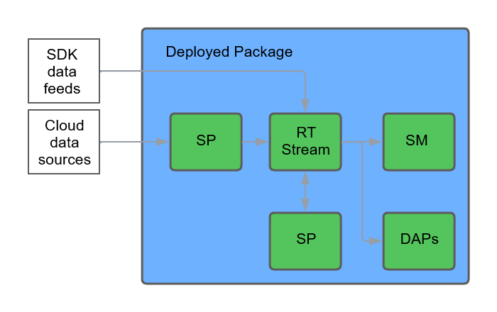 The Stream Processor is used for getting data in, streaming data out, and creating streaming analytics such as derived data and alerts. Multiple input and output sources are built-in. For anything not built-in, data can be written directly to a Stream (Reliable Transport) via the C or Java RT SDK. The Stream Processor can then read the data from that stream if required, or it can be written directly into a database.