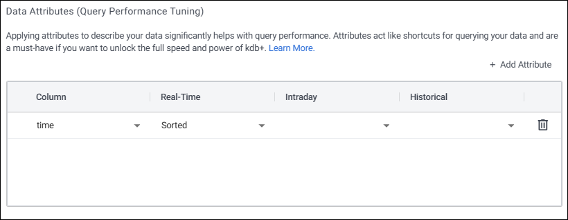 Applying attributes to your tables can significantly improve their performance. Real-time, intraday and historical attributes are a key performance tuning point for modifying the performance of queries in a kdb Insights Enterprise database. Attributes can be set differently depending on the different tiers of your database and can be tuned to optimize performance at each tier.