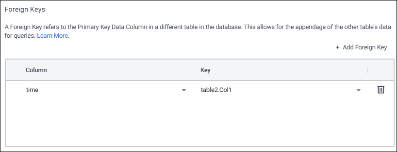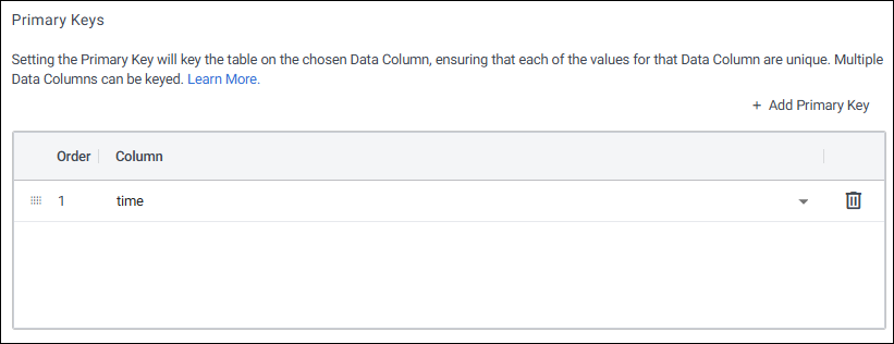 Setting the Primary Key assigns a unique key constraint to the specified data column(s), ensuring that all values in that column are distinct and can be used to uniquely identify each row in the table. Multiple Data Columns can be keyed. The table is keyed by these columns and any updates that have matching keys update records with matching keys.
