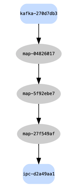 This example is a simple linear transformation pipeline from Kafka source to tickerplant sink, and can be visualized using the pipeline REST API on the Controller or Worker when deployed: