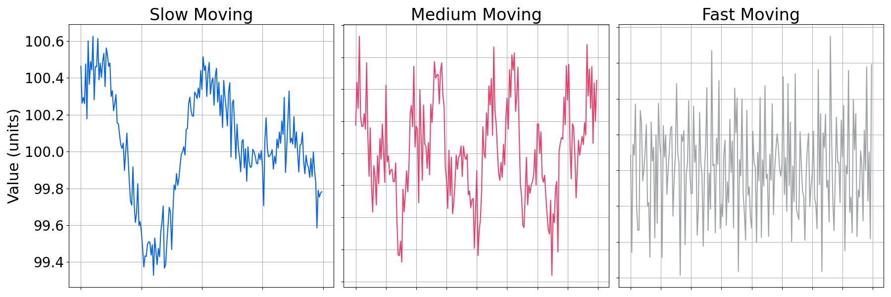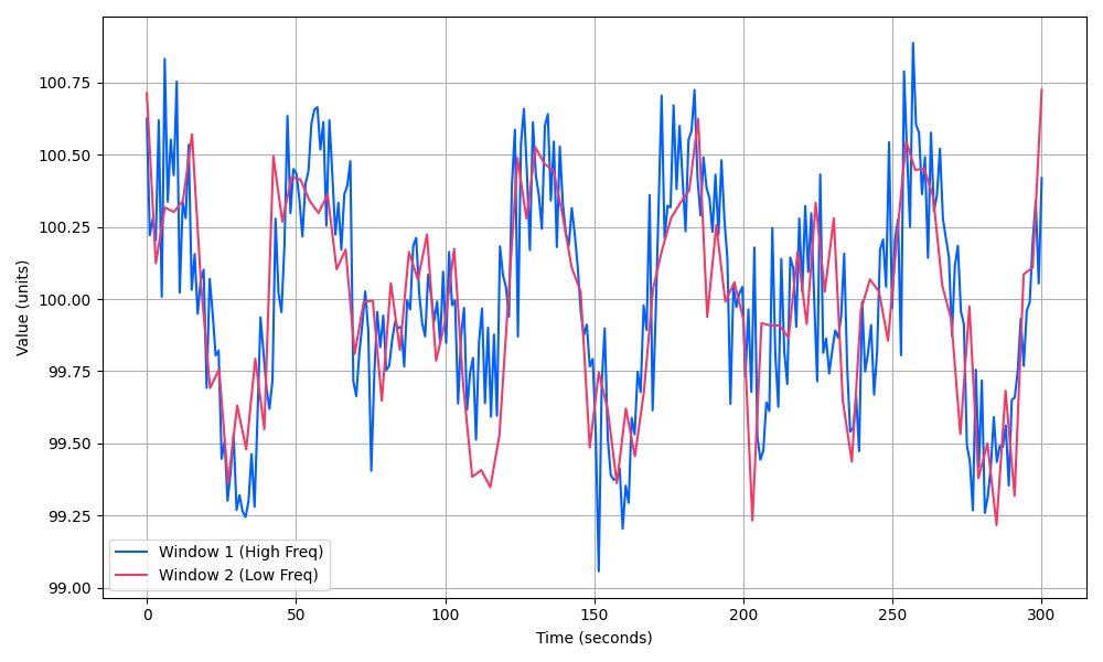 The above diagram depicts two series with differing lengths. When considered in the same temporal window, these series display a high level of correlation, however, on a point-by-point basis they do not. This is a typical occurrence in a number of fields, for example, sensors with different sampling rates, or assets with different tick rates due to trading frequency.
