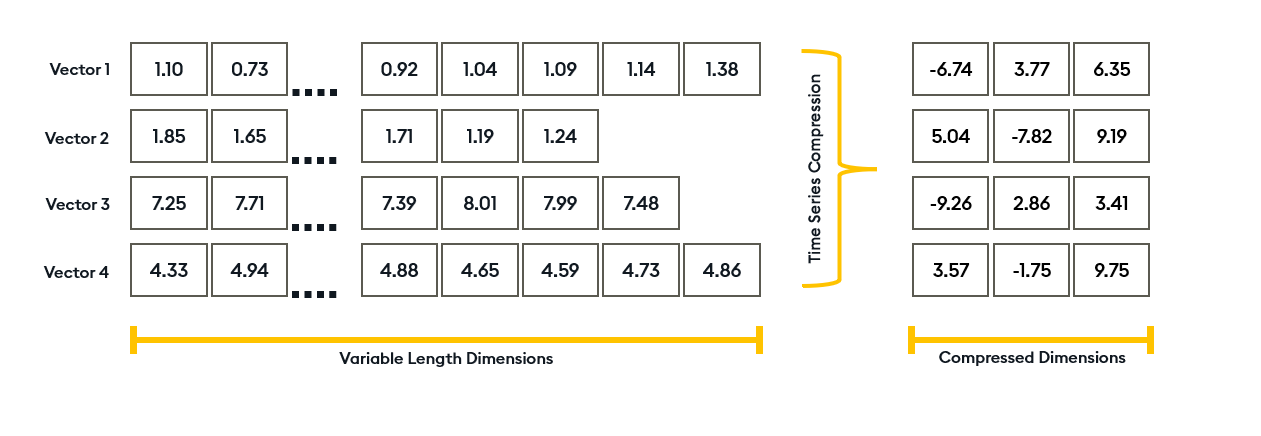 The method dimensionally reduces time series vectors in a way that preserves the majority of the similarity between vectors. This helps you utilize the power of vector databases at scale. See the following visual representation of dimensionality reduction: