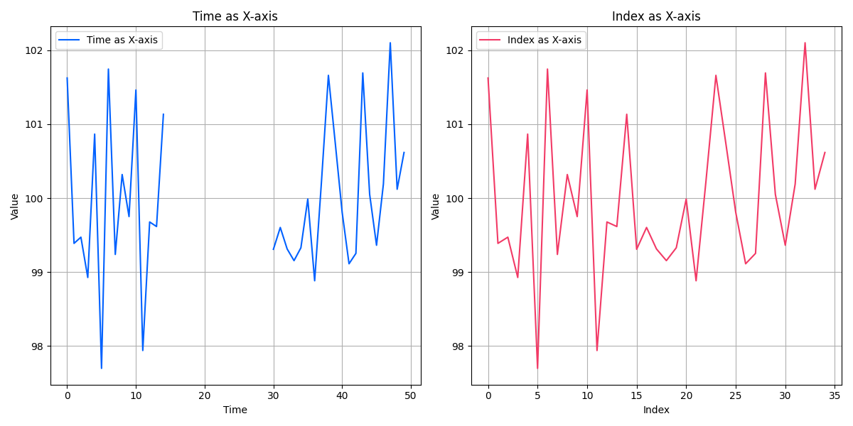 With both Window only and Transformed TSS, vectors are considered one-dimensionally. This impacts how we manage gaps. The below figure on the left shows time series data with a time gap. The figure on the right shows how an index would compare the pattern. It's best to consider this if you're doing fixed point windowing and if windows have differing timesteps within the same window.