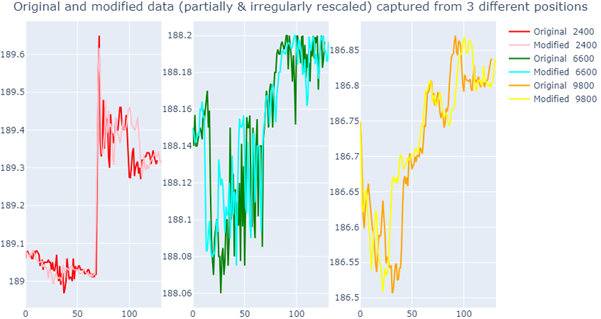 Warp the query to illustrate the power of DTW that deformed queries can still capture the original patterns. Now we apply rescaleFactors:(40#0.7),(60#1.4),(27#0.7) which means the first 40 spaces will be rescaled with ratio 0.7, and so on for the next 60 spaces and next 27 spaces with rescale-ratio 1.4 and 0.7 (for example total 40+60+27+1 = 128 data).